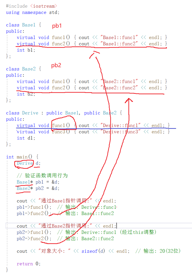 pb2->func1(); // 输出: Derive::func1 (经过this调整)