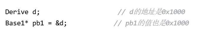 Base1* pb1 = &d; // pb1指向Derive对象起始地址