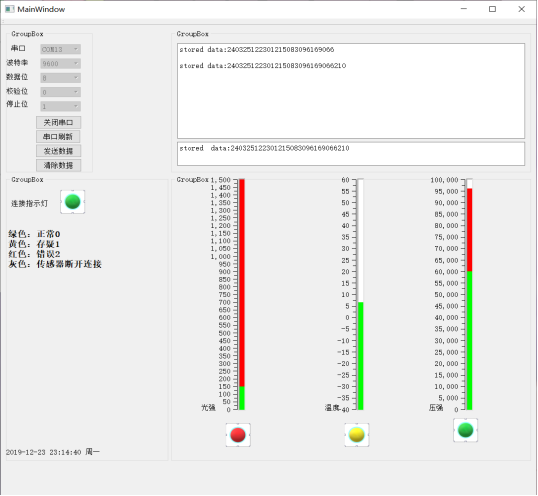 - 接收数据:使用信号readyRead(),在槽函数中读取串口接收的数据,转换为中文格式并显示在接收框中。