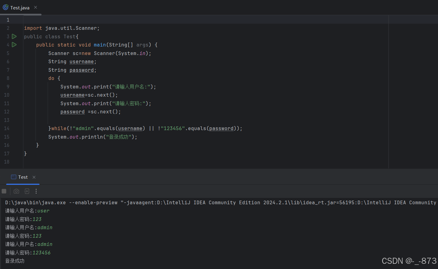 下面编写程序模拟登录,用户名为admin,密码为123456,如果用户输入的用户名和密码不匹配,就重新登录,直到用户名和密码完全匹配为止,代码如图所示: