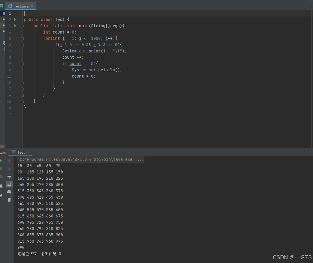 接下来编写一个输出1~1000既能被5整除又能被3整除的数,并且每行输出5个,代码如图所示: