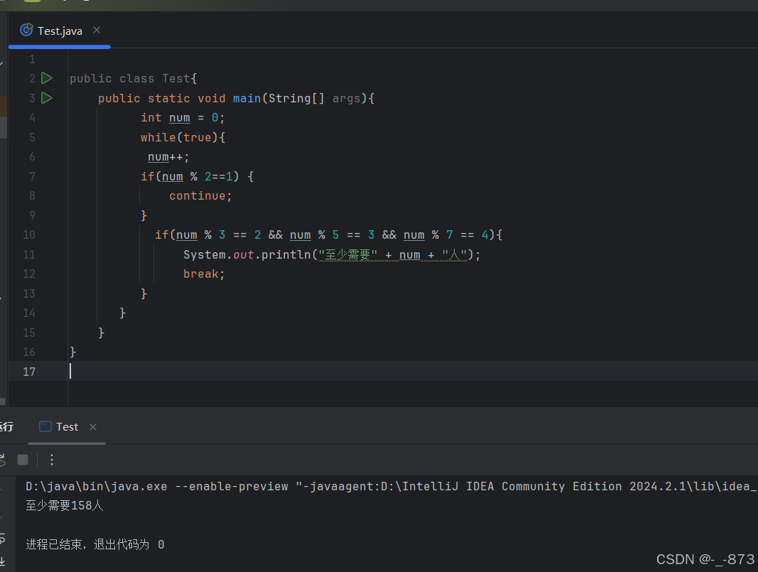 韩信点兵,三人一组余两人,五人一组余三人,七人一组余四人,且为了便于编队,人数不能是奇数,编写程序,计算最少需要多少名士兵,代码如图所示: