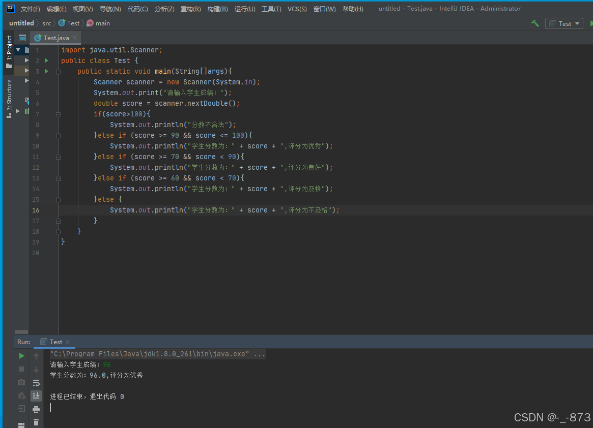 接下来编写程序,接收用户输入的分数,对分数进行判断:90(包含)~ 100(包含)分为优秀,70(包含)~ 90分为良好,60(包含)~ 70分为及格,60分以下为不及格,代码如图所示: