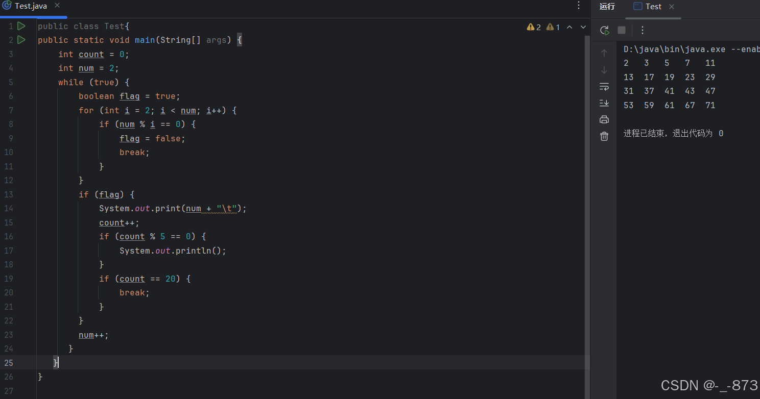 接下来编写程序,寻找前20个素数,并且每5个为一行输出(如果一个数字不能被1和