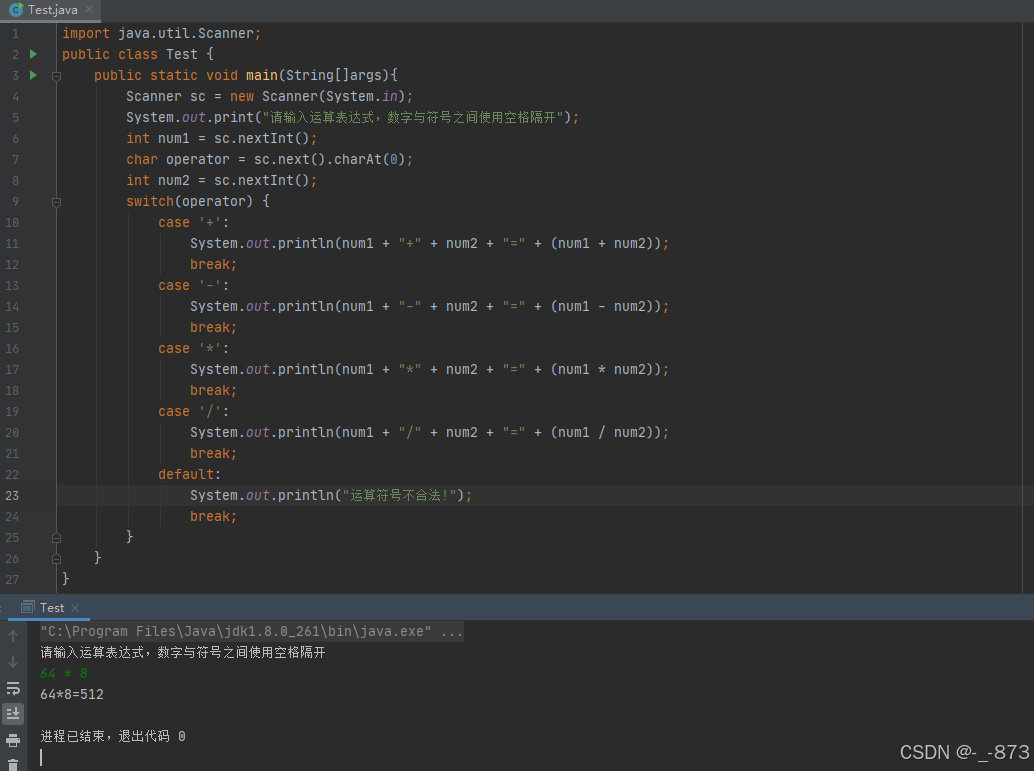 接下来编写一个简单的加减乘除计算器。用户输入两个数字和计算符号,根据计算符号决定执行加法、减法、乘法、除法运算,如图代码所示:
