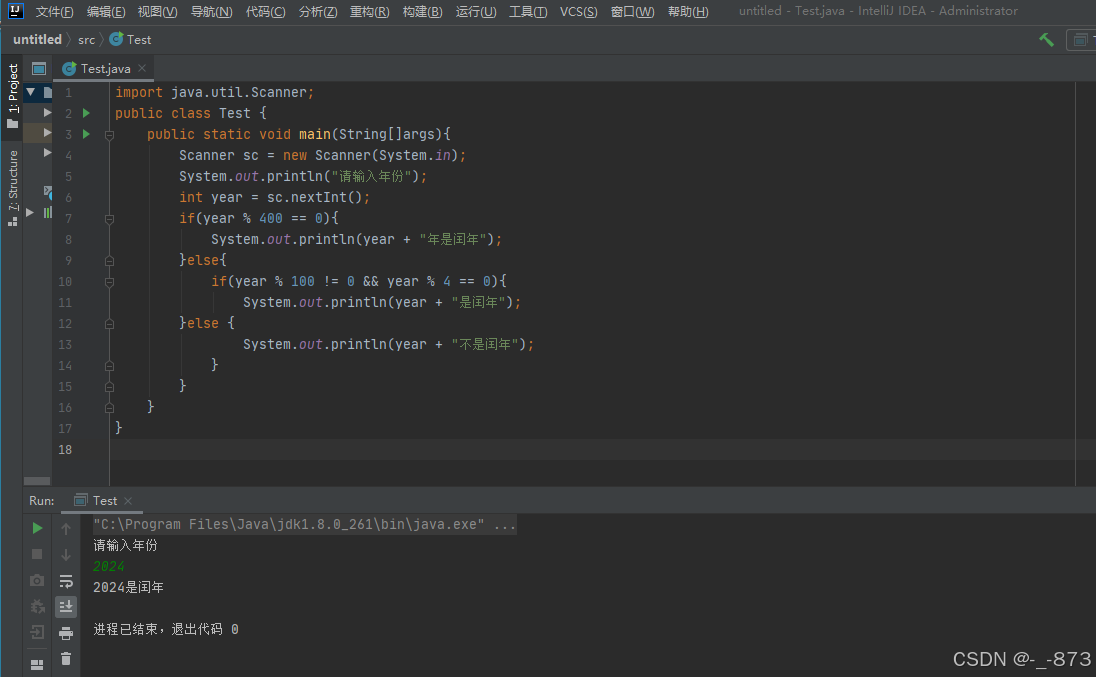 编写程序,判断一个年份是否为闰年。闰年的判断方法为:如果一个年份能被400整除,那么该年是闰年。否则,如果这个年份不能被100整除,但可以被4整除,也是闰年,如图代码所示: