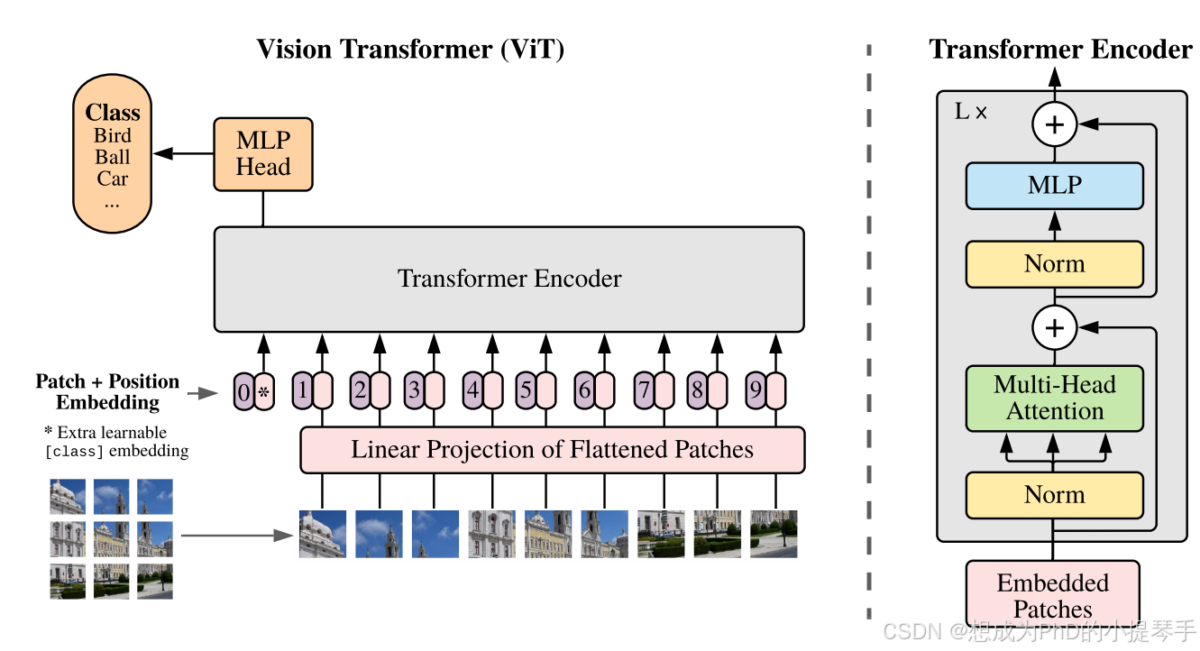 论文阅读6——VIT:Vision Transformer(包括ViT代码复现) 虽然Transformer架构已成为自然语言处理任务的事实标准,但其在计算机视觉中的应用仍然有限。在视觉中,注意力要么与卷积网络结合应用,要么用于替换卷积网络的某些组件,同时保持其整体结构。我们表明,这种对CNN的依赖是没有必要的,并且直接应用于图像补丁序列的纯Transformer可以在图像分类任务中表现得非常好。