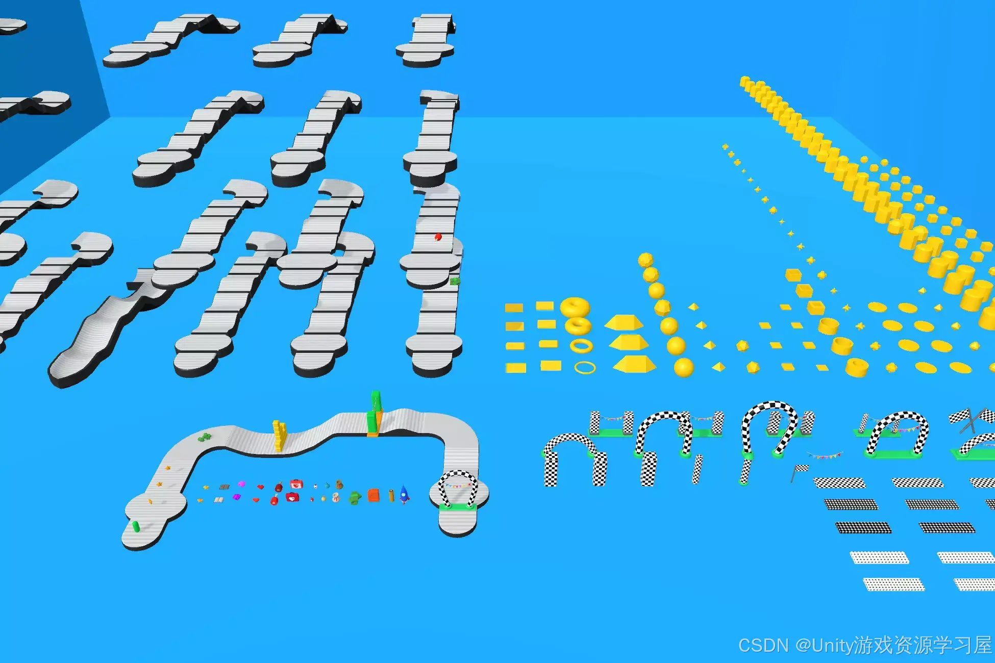 多种地形模块:直线、弯道、坡道等,可以自由拼接关卡