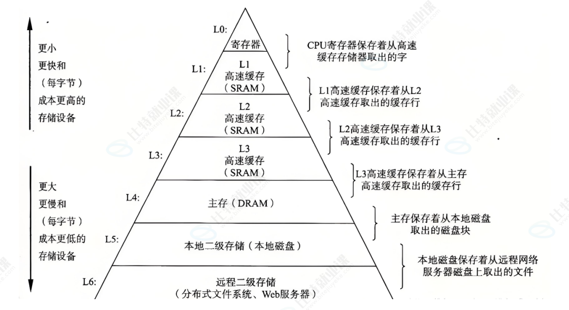 计算机用于存储的单元是非常多的,离 CPU 越近的话,就越小,越快,成本越高;离 CPU 越远的话,就越便宜,越大,越慢。比如:寄存器数量非常少,但是特别快。磁盘存储空间特别大,但是很慢。