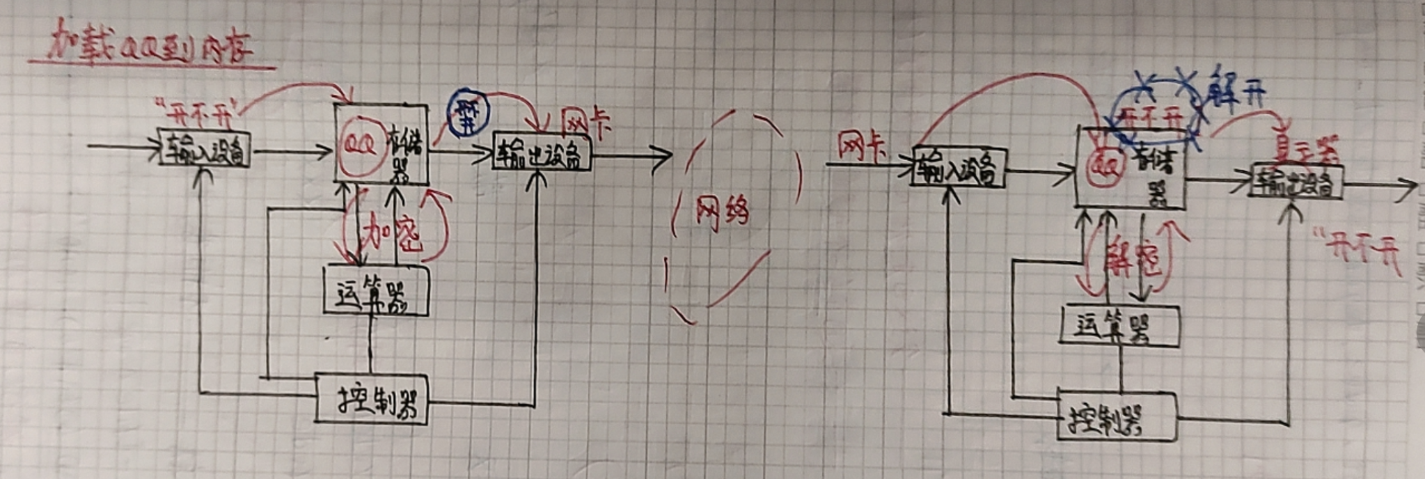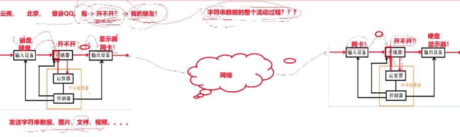 "开不开" 这个数据从键盘(输入设备)上输入,会先加载到内存中,由 CPU 进行处理(加密)之后,通过网卡(输出设备),经由网络传输,发送到对方的 QQ 上,对方的网卡(输入设备)会先将 "开不开" 这个数据加载到他的内存中,经过 CPU 处理(解密),显示到他的显示器上(输出设备),就看到你发的消息了。