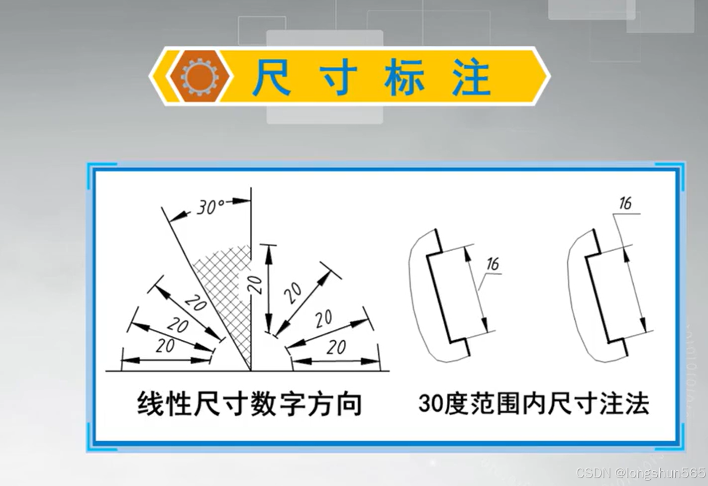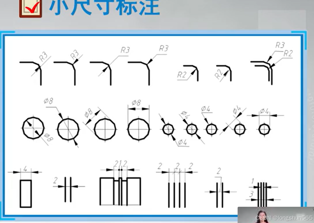 - 尺寸组成:尺寸界线,终端(箭头),数字,尺寸细线