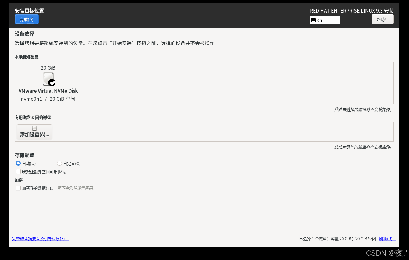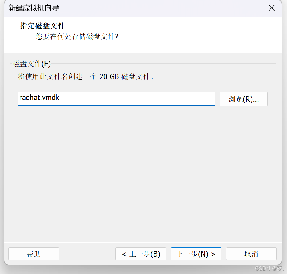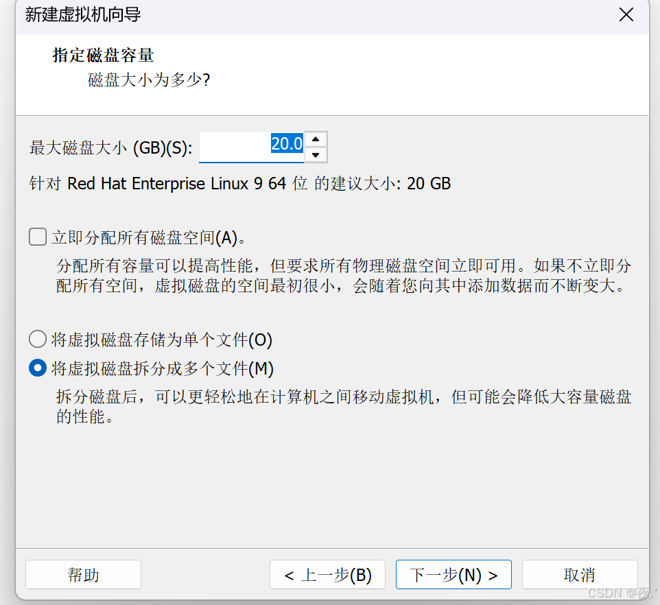 磁盘大小我们可以指定大小,例如:20GB,需要注意,推荐选择虚拟磁盘储存为单个文件,或者默认的拆分为多个文件即可,不推荐立即分配。