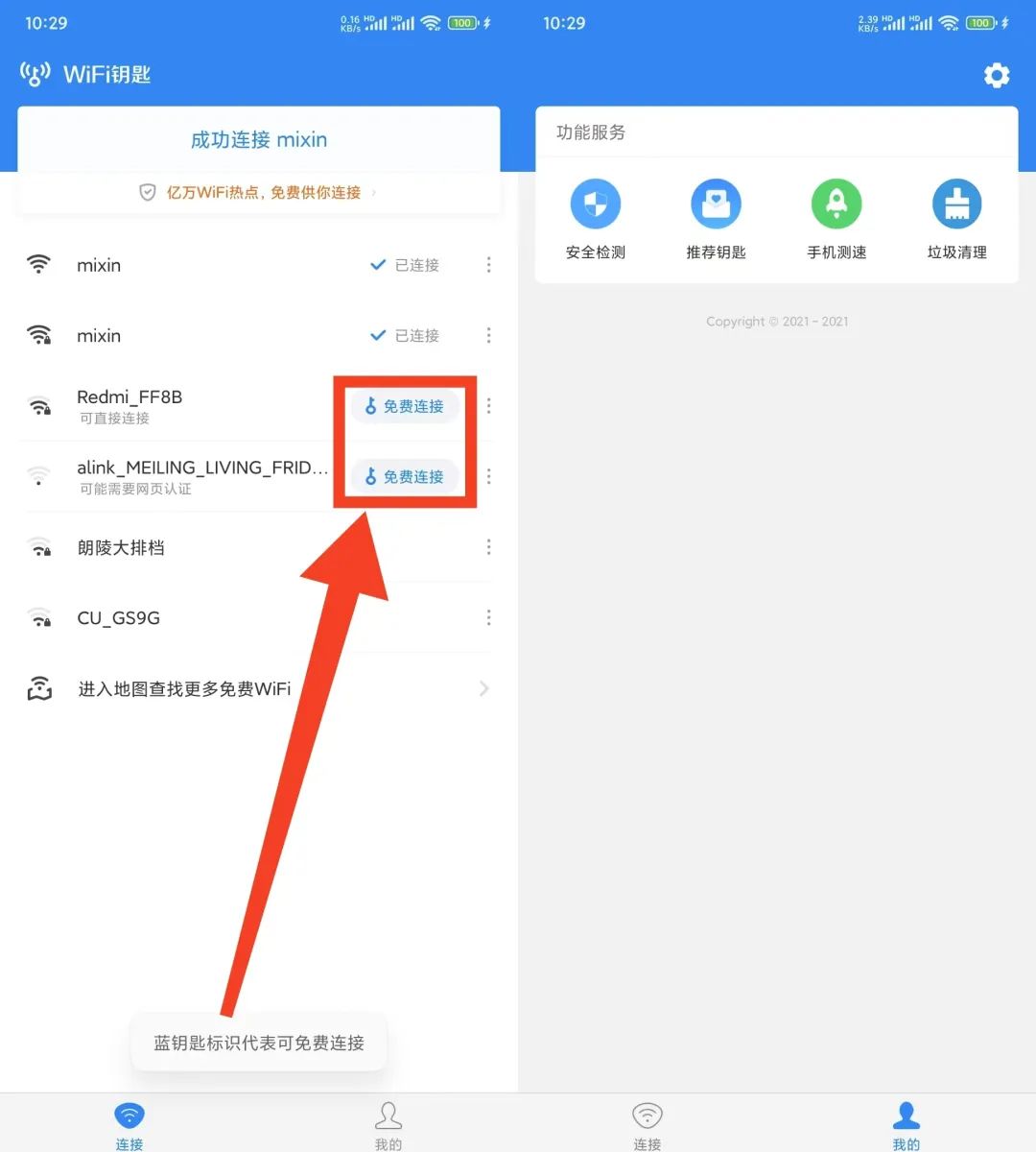 使用方法和普通版一样,首先自动查询周边可以连接的WiFi,后面带有蓝色钥匙小图标的WiFi就是可以免费连接的!