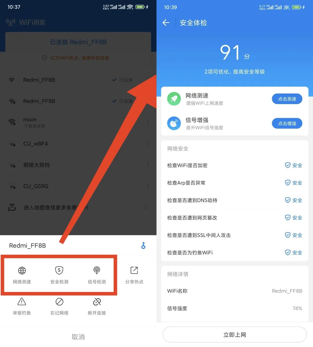然后再来看下相关的功能,可以看到图中的网络测速、安全检测、信号检测等多种功能,完全可以正常使用!