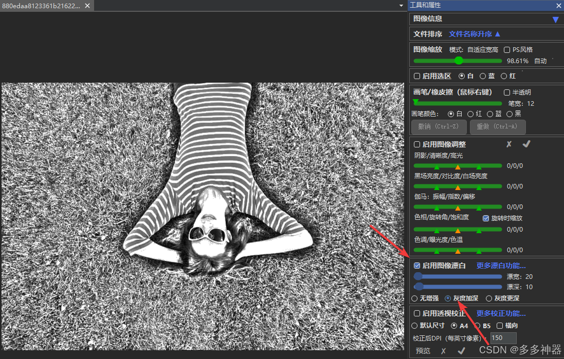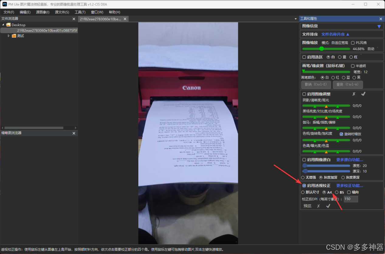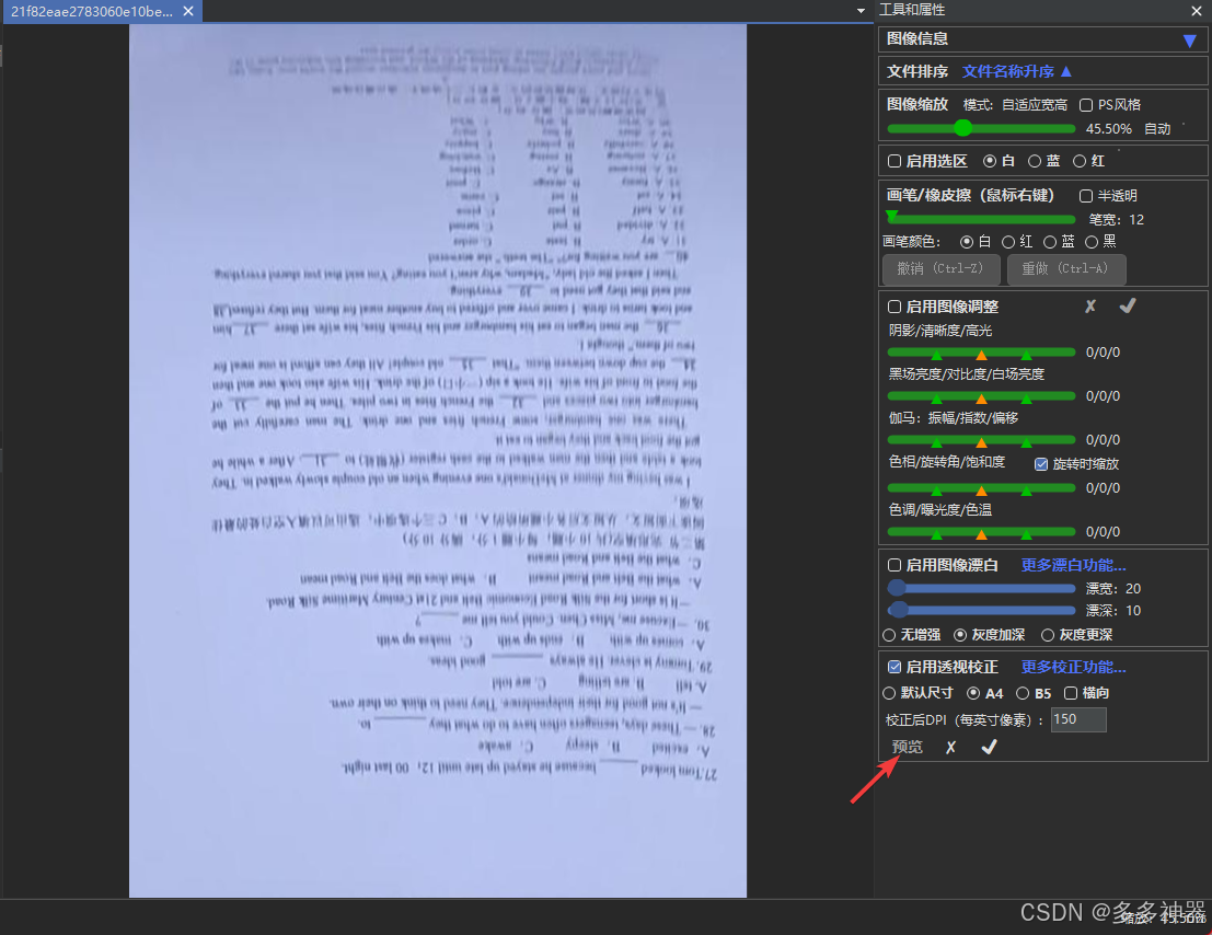 软件有校正功能。可以通过鼠标左键进行四点透视校正,将图像有效区域校正为默认尺寸/A4/B5。