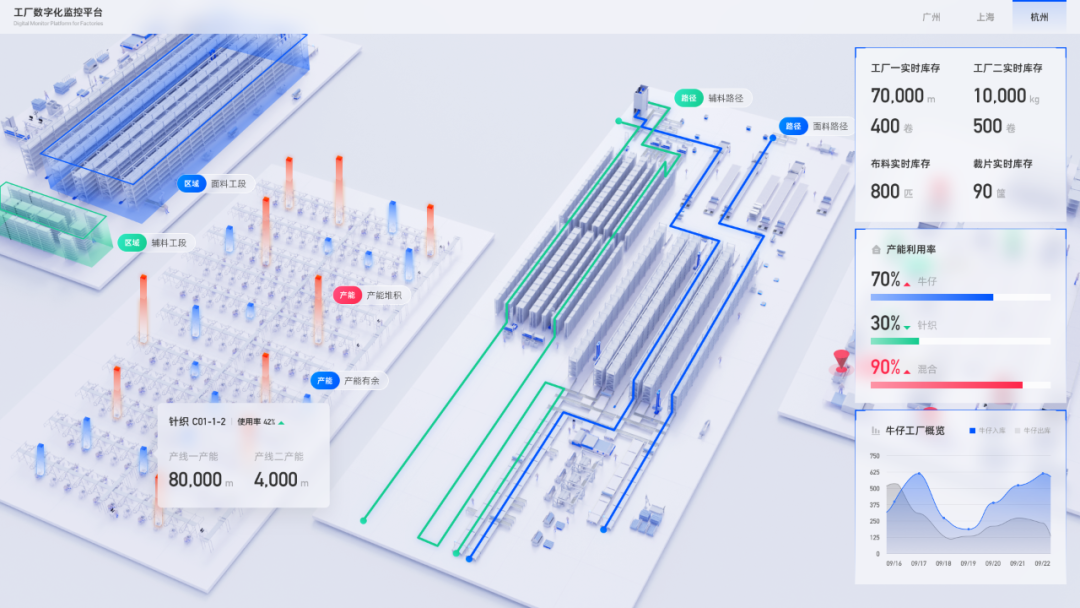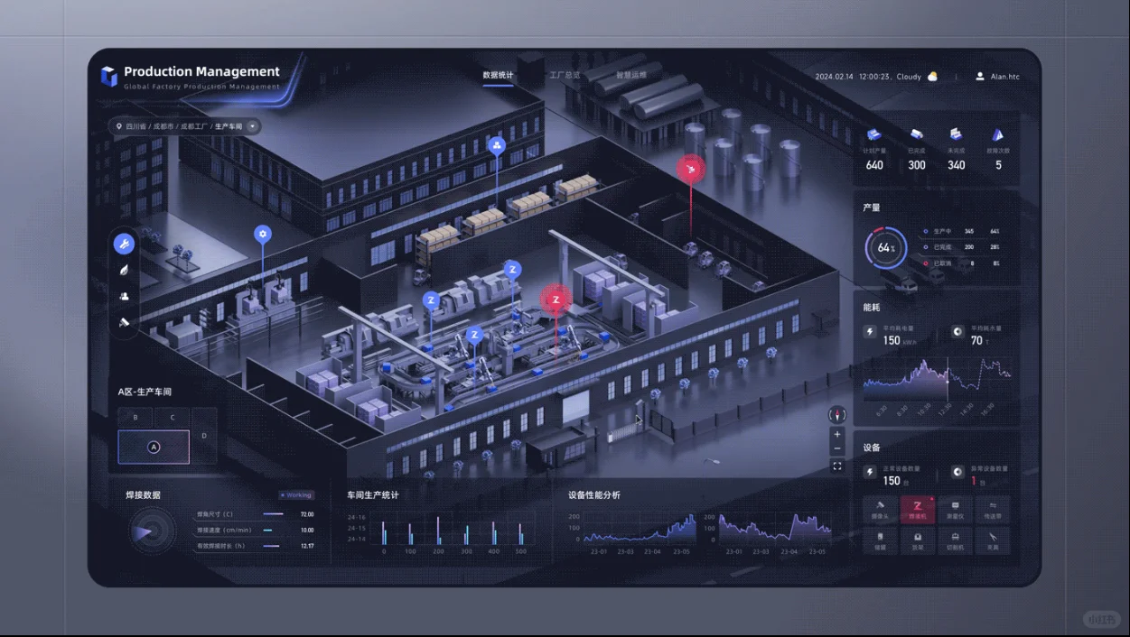 - 可视化决策环境: 通过3D界面直观展示设备健康度、物料流向、产能瓶颈(如用颜色标注高负荷设备),让问题一目了然。