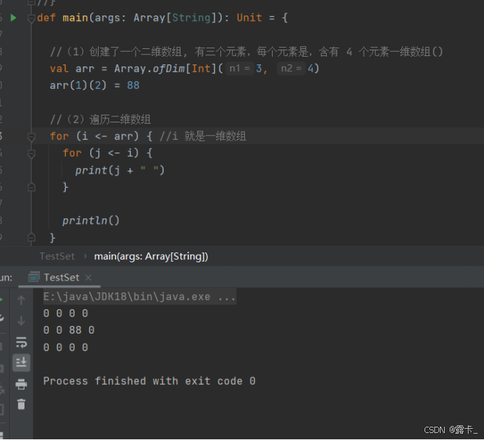 val arr = Array.ofDim[Int](3, 4) arr(1)(2) = 88