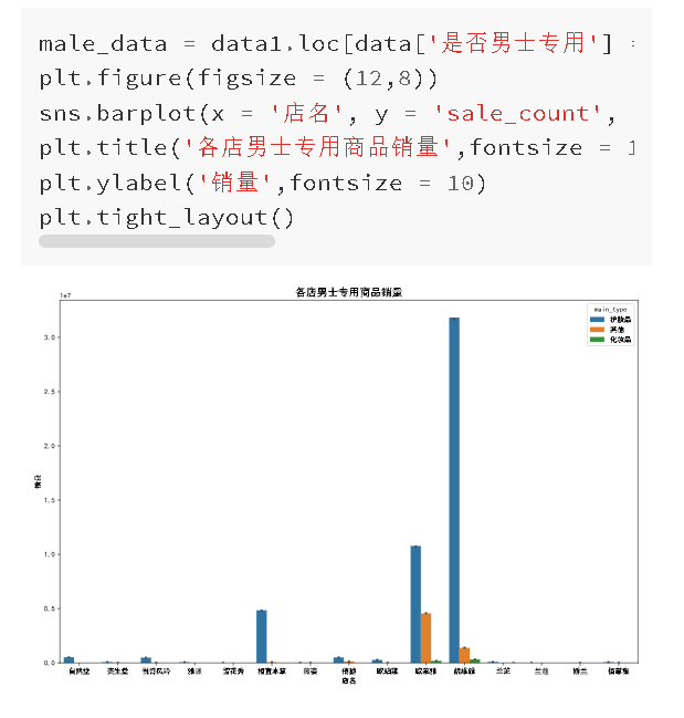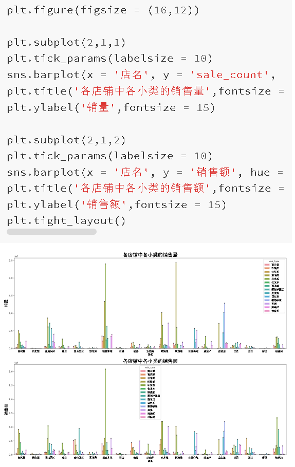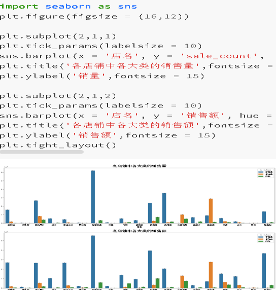 接下来用seaborn包给出每个店铺各个大类以及各个小类的销量销售额