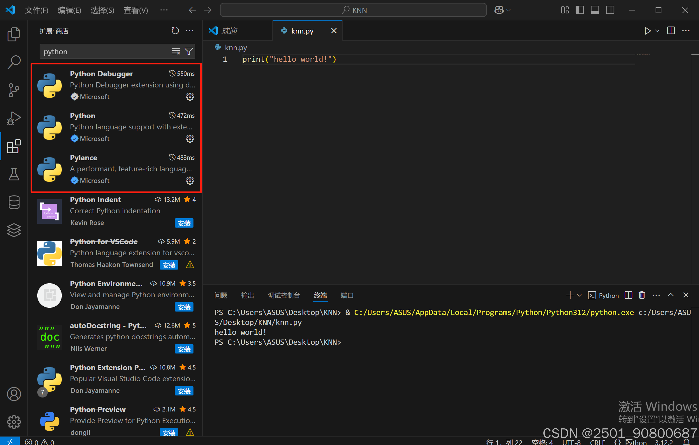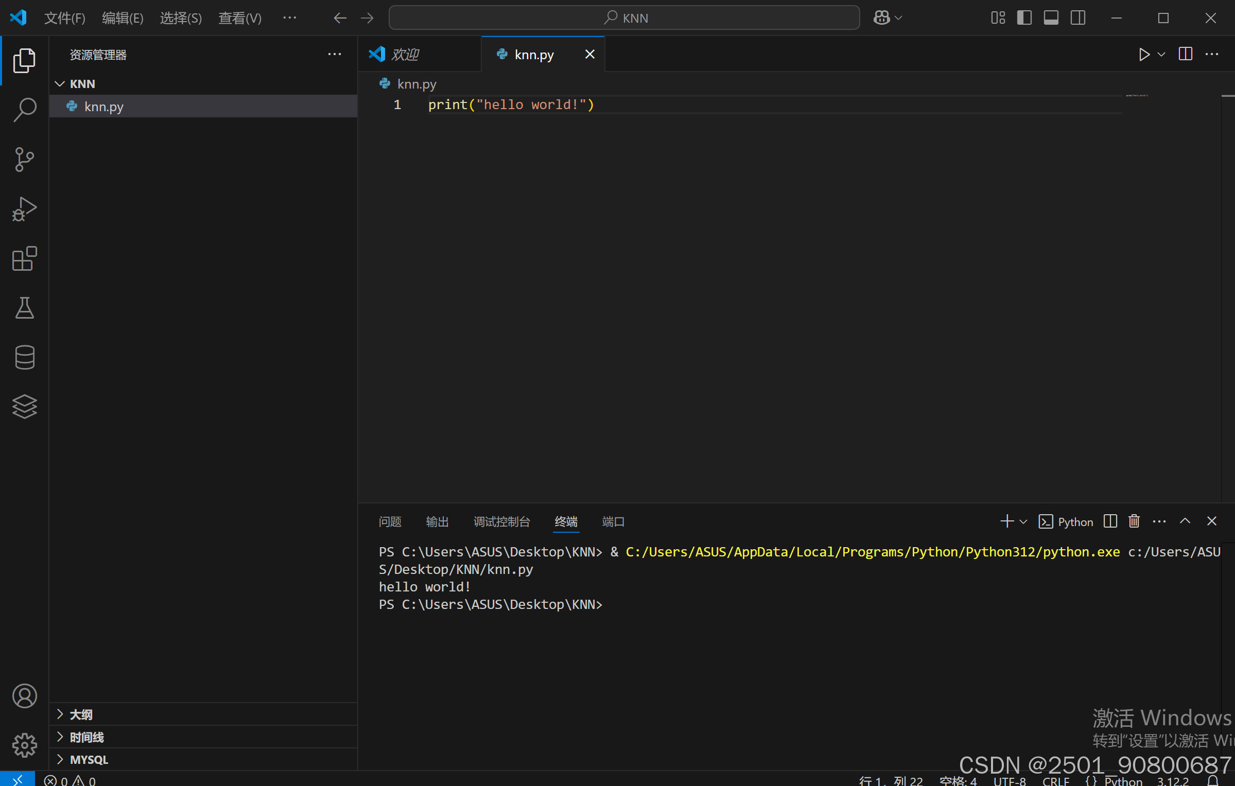 - 新建文件,并输入测试样例print(“hello,world!”)