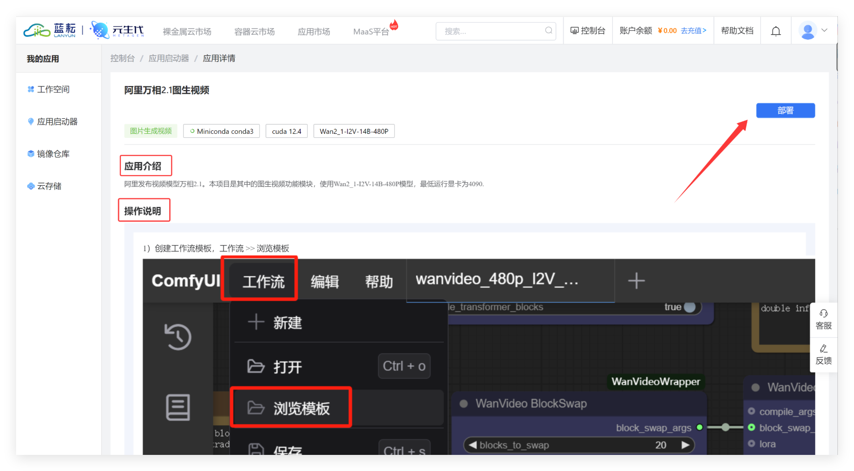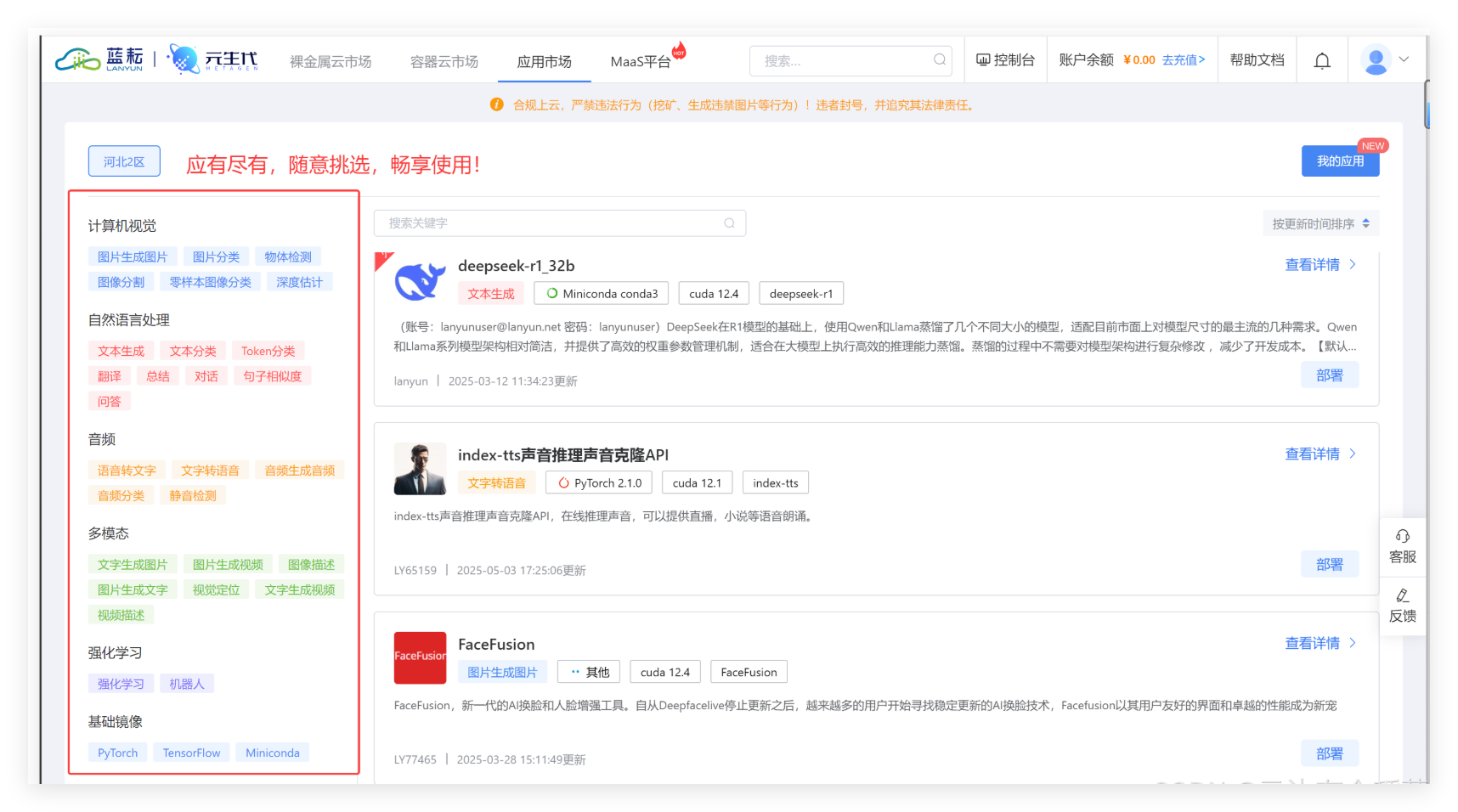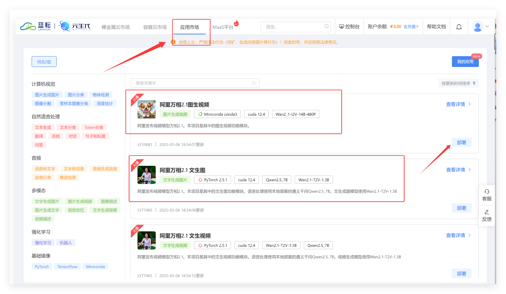 进入蓝耘平台,点击应用市场,我们清晰的看到有火爆的阿里万相2.1图生视频等强大功能,随心选择,畅享使用!