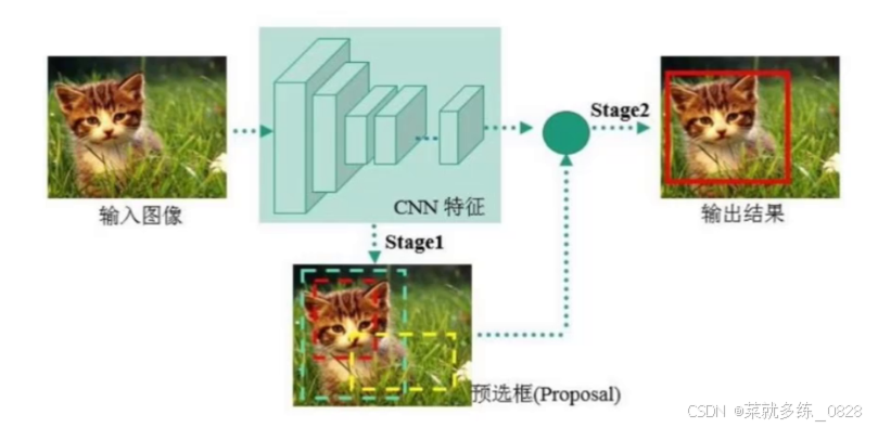 两阶段目标检测器是一种先生成候选框,然后对候选框进行分类和回归的检测方法。这种方法主要包括两个阶段: