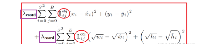 前面的求和符号s平方表示网格的格式,例如YOLO v1中的网格个数为7*7,然后B表示预选框的个数,此处数值为2,后面的x表示预选框的中心点的坐标x,y,以及预选框的宽w、高h。