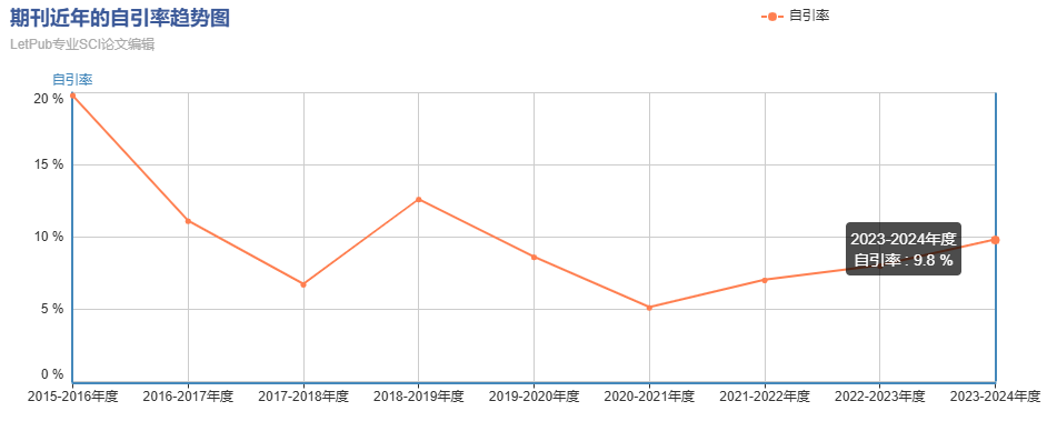 该刊自引率最高峰值在2015年度,高达19.80%,后面有所把控,但2018年度再次上升,高达12.60%,而后持续下降,在2020年度后呈上升趋势,其最新自引率为9.80%。
