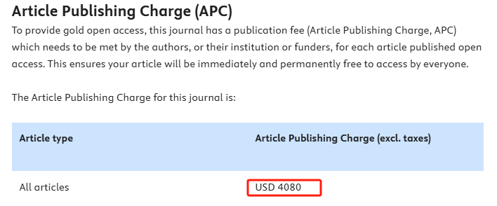 该刊为混合期刊,如选择传统模式出版,则无需支付版面费。如选择OA出版,则需支付版面费4080美元(约合人民币29765元)
