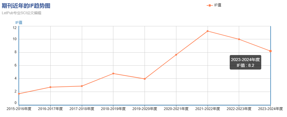 该刊影响因子总体呈上升趋势,其最高峰值在2021年度,高达11.245,近两年有所下降,其最新影响因子为8.2。