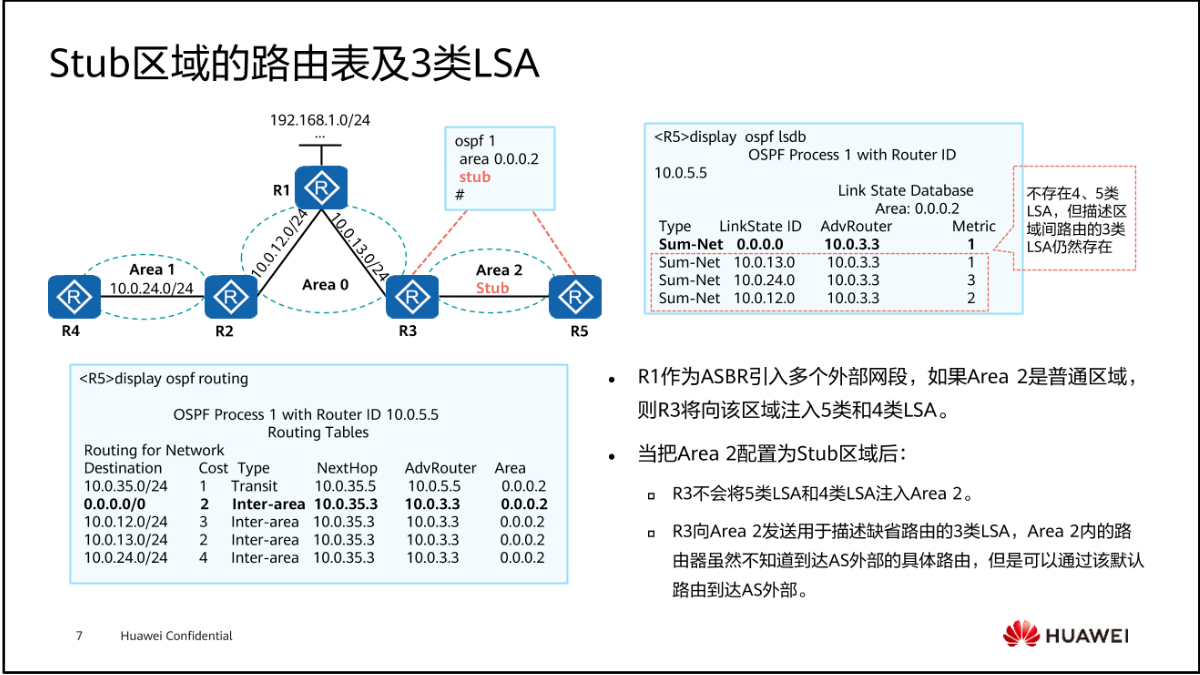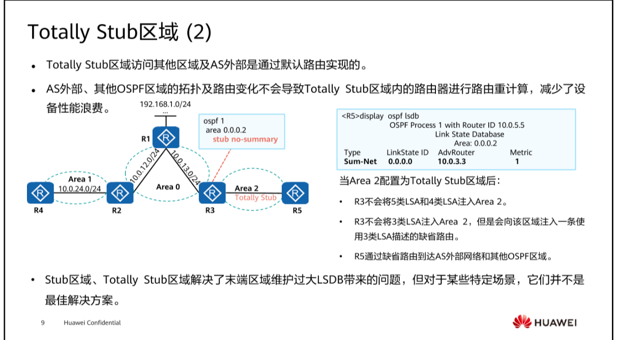 3.路由表构成:仅包含区域内路由(LSA 1/2生成)和1条默认路由,规模极小,是OSPF中路由表最简单的区域类型。