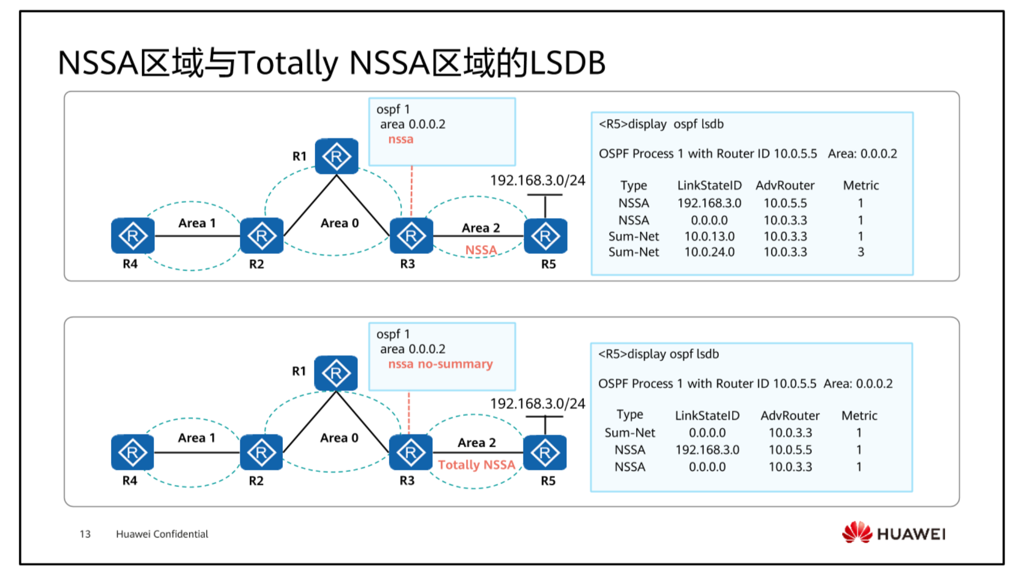2.当LSA 7需要传递到NSSA以外的其他区域时,ABR会将其转换为LSA 5,确保外部路由在整个OSPF域内互通。