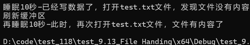 printf("睡眠10秒-已经写数据了,打开test.txt文件,发现文件没有内容\n");