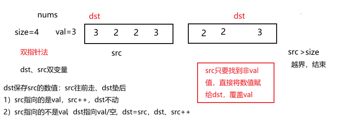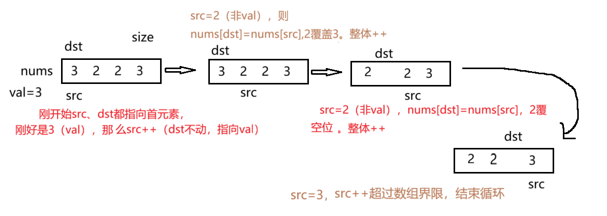 --开头 src、dst 都在数组第一个元素,恰好 src = val(3),那么 src++(dst 不动,指向val值)。src = 2(非val),那么 nums[dst] = nums[src](2覆盖3),整体++。src = 2(非 val,dst指向空),src再++(dst不动)……最后src超过numsSize(循环终止条件),dst 指向nums[2]——>dst=2(要求返回的k值)。