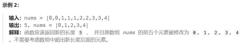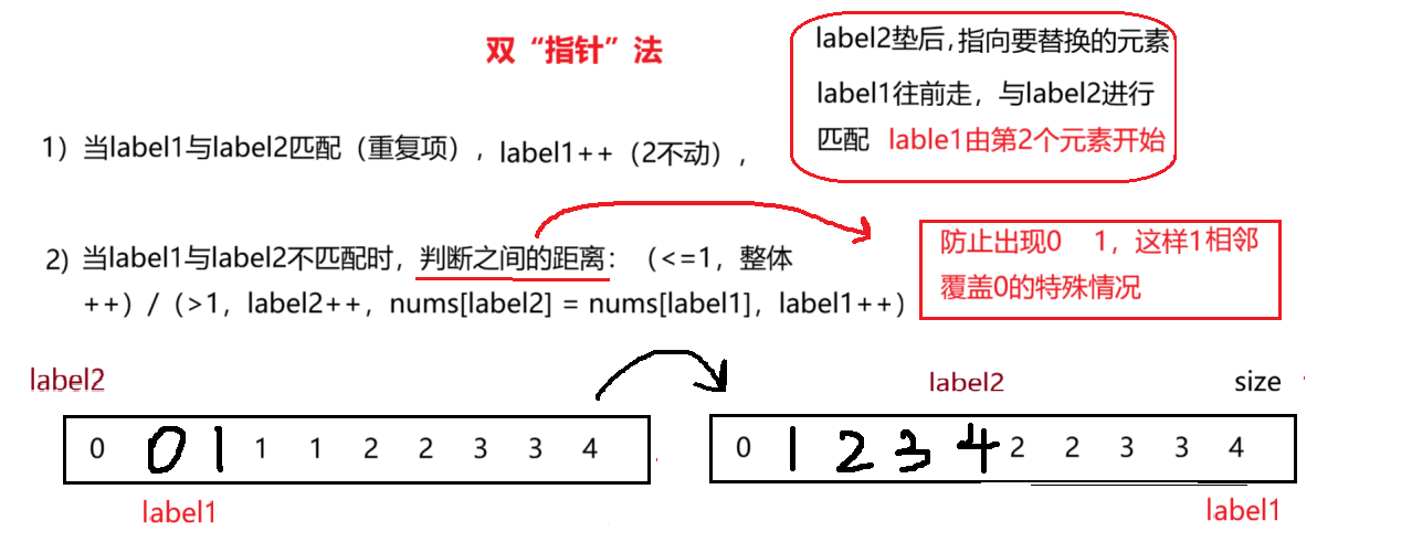 - 使用两个标记点来遍历数组,第一个标记点指向当前不重复数字的最后一个位置,第二个标记点负责在前面寻找新的不重复数字。