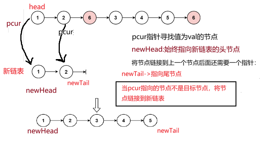 (循环中,进行条件判断值不是 val 的节点,再尾插链接)