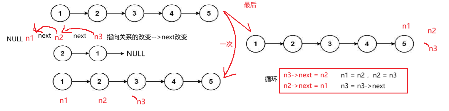 - 方法二:创建三个指针,改变之间的指向关系。可见时间复杂度:O(N)。