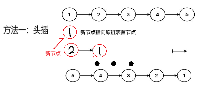 - 方法一:(容易想到,易懂)创建新链表,申请一个节点大小的空间,每次在头节点进行头插。(创建新链表,遍历原链表,将节点头插到新链表),显然时间复杂度:O(N)。