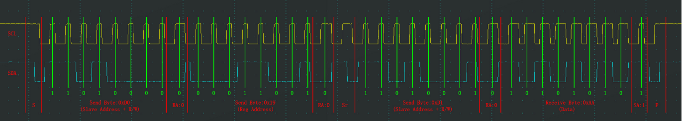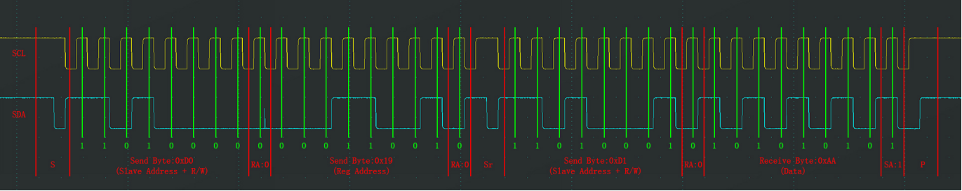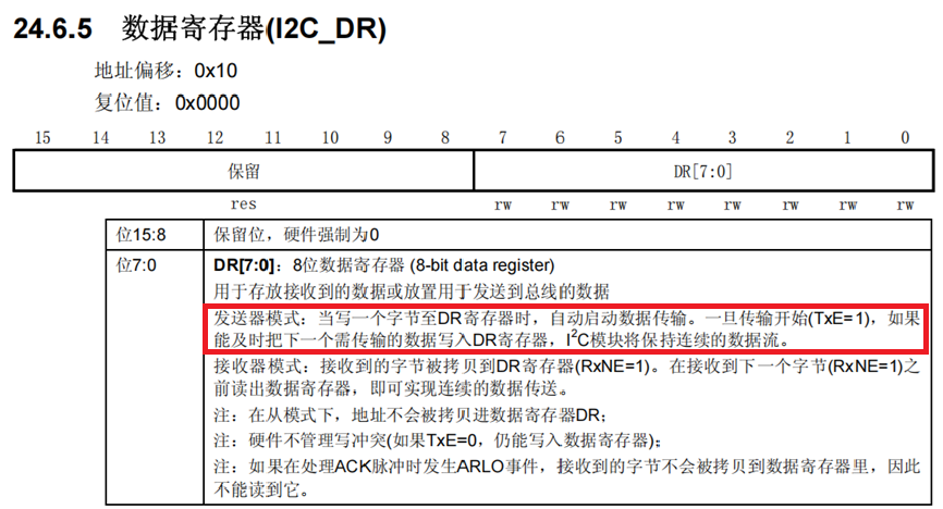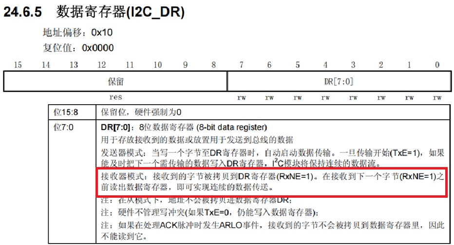 如果想要读取多个字节,直接等待EV7事件,读取DR,就能收到数据,这样依次接收,在接收最后一个字节之前,也就是这里的EV7_1事件,需要提前把ACK置0,STOP置1;如果只读一个字节,在EV6直接之后,就要立刻ACK置0,STOP置1,要是设置晚了,时序就会多一个字节
