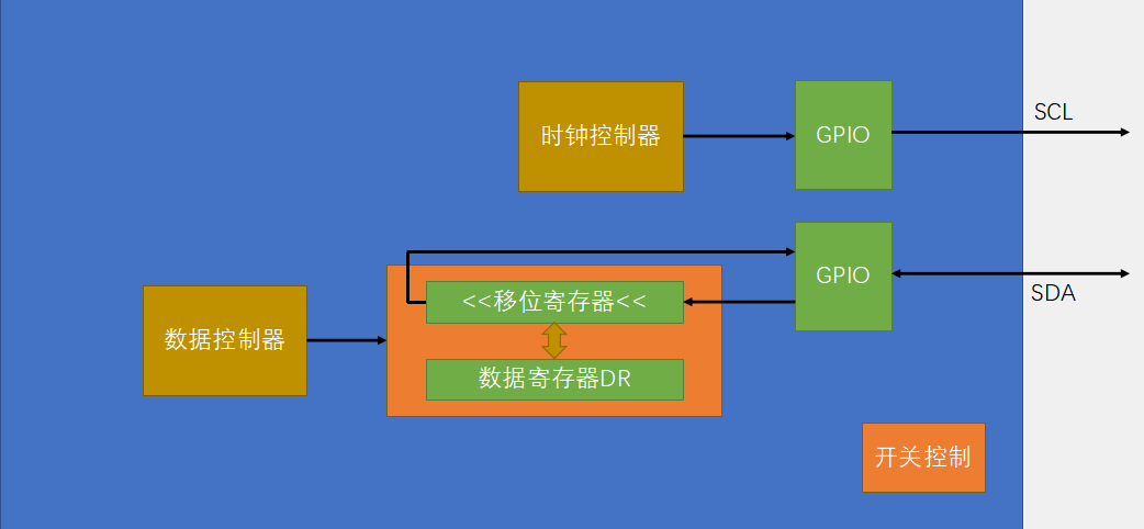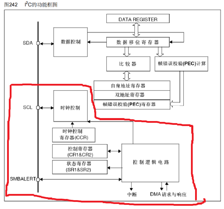 比较器和地址寄存器(自身地址寄存器、双地址寄存器):从机模式使用,可变多主机模式,自身地址寄存器可以自定义的写入地址,如果STM32作为从机,在被寻址时,收到的寻址通过比较器判断,和自身地址相同,那STM32作为从机,响应外部主机的召唤,并且STM32支持同时响应两个从机地址,所以又有双地址寄存器