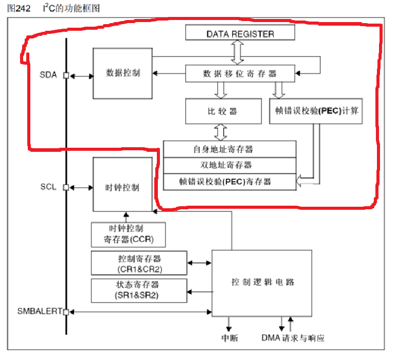PEC计算和寄存器:数据校验模块,当发送一个多字节数据帧时,在PEC计算里硬件可以自动执行CRC校验计算(根据前面的数据,进行各种数据运算,得到一个字节的校验位,附加在数据帧的后面),接收到这个数据帧后,STM32硬件自动执行校验判断,如果数据在传输过程中出错了,CRC校验算法就通不过,硬件就会置校验错误标志位