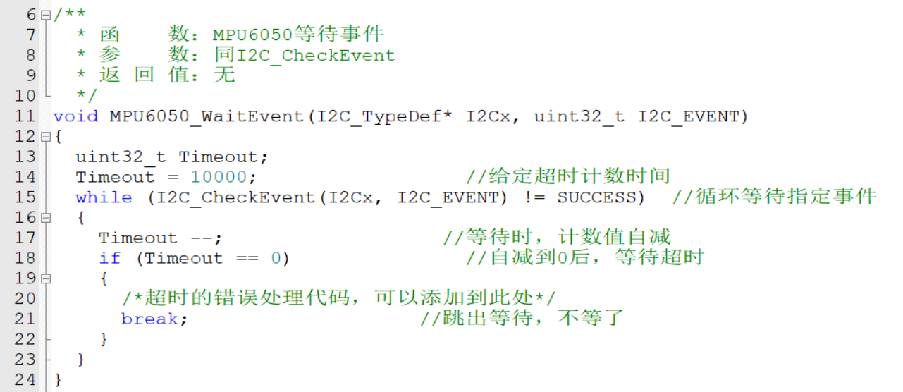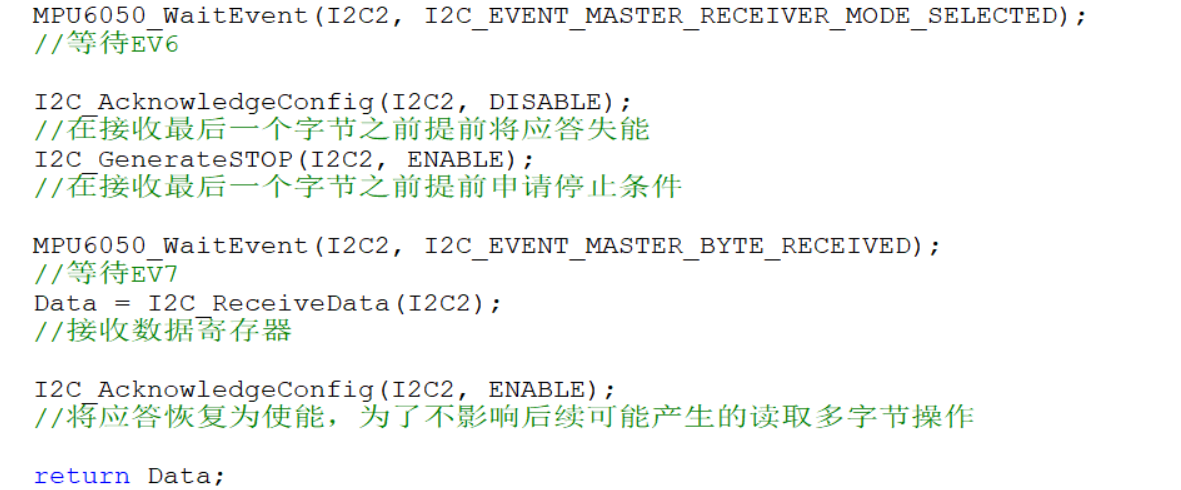 这里是读一个字节,代码思路:我们是在EV6之后,也就是收到最后一个字节之前,临时把ACK置0,非应答,STOP置1,所以接收函数的最后要恢复默认的ACK=1