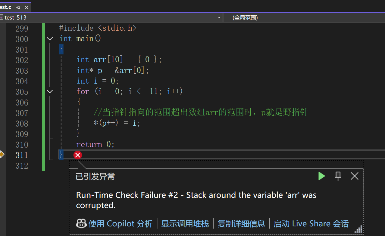 概念:野指针就是指针指向的位置是不可知的(随机的、不正确的、没有明确限制的)