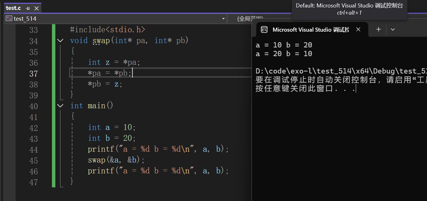 我们可以看到swap的方式,顺利完成了任务,这里调用swap函数的时候是将变量的地址传递给了函数,这种函数调用方式叫:传址调用。