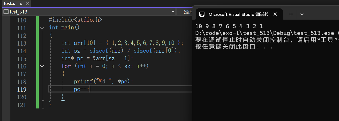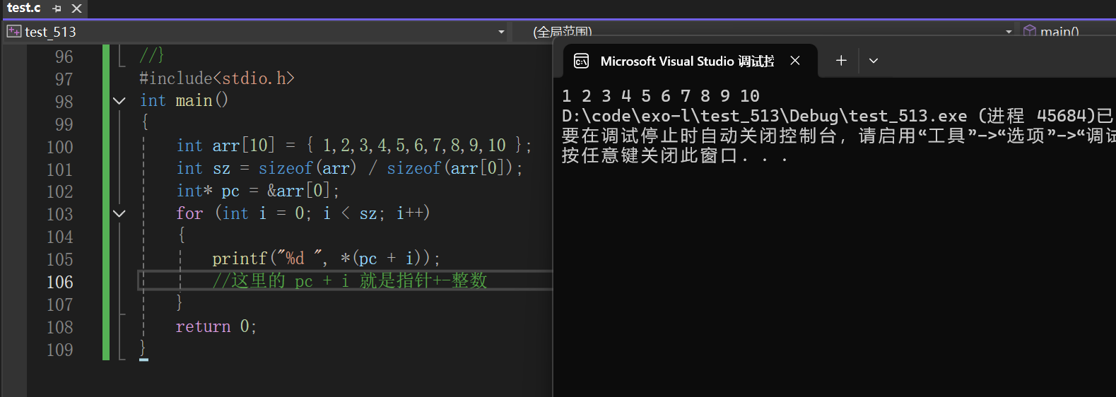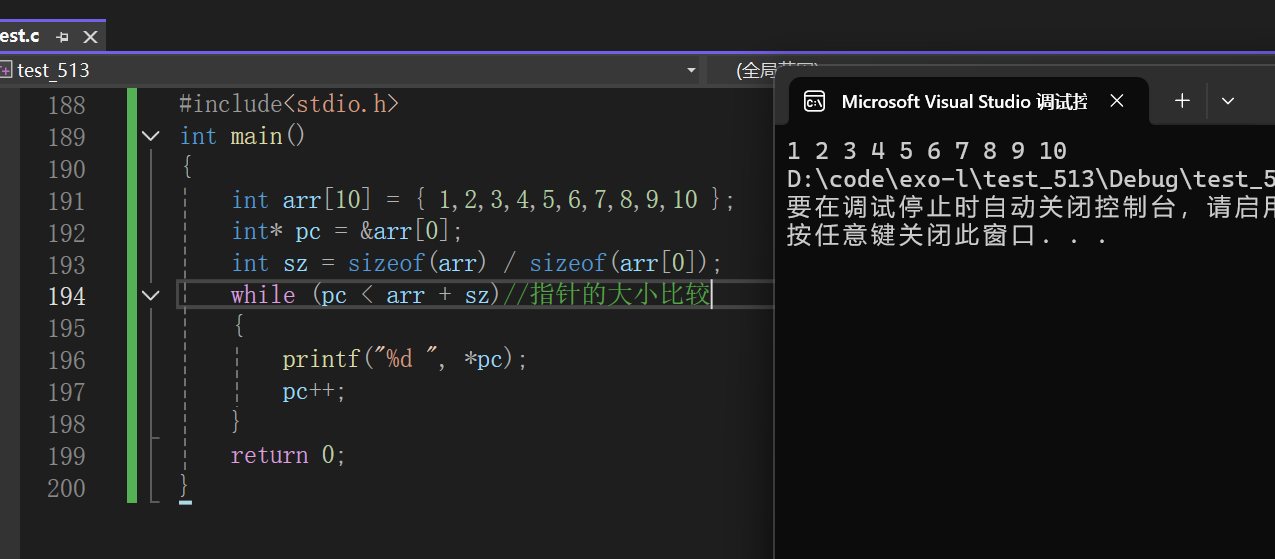 我们利用上述学的知识找到arr[0]的地址,然后不断让p++,这里的p+1就相当于他向前走了四个字节。(指针变量存储的是内存地址。对于指向数组元素的指针(这里 p 指向 arr 数组首元素),p++ 会使指针指向下一个数组元素的内存地址。在 C 语言中,指针自增的步长取决于它所指向的数据类型。这里 p 是 int * 类型指针,指向 int 型数据,int 在常见系统中占 4 字节(32 位系统)或 8 字节(64 位系统),p++ 会让指针的地址值增加相应字节数(如 4 字节或 8 字节 ),指向下一个 int 元素。在代码的 for 循环中,每次执行 p++,p 就会从指向当前数组元素变为指向下一个数组元素。循环首次执行时,p 指向 arr[0] ,执行一次 p++ 后,p 指向 arr[1],再执行一次 p++,p 指向 arr[2],依此类推,从而实现通过指针遍历数组元素,配合printf("%d ",*p) 语句依次输出数组每个元素的值。)