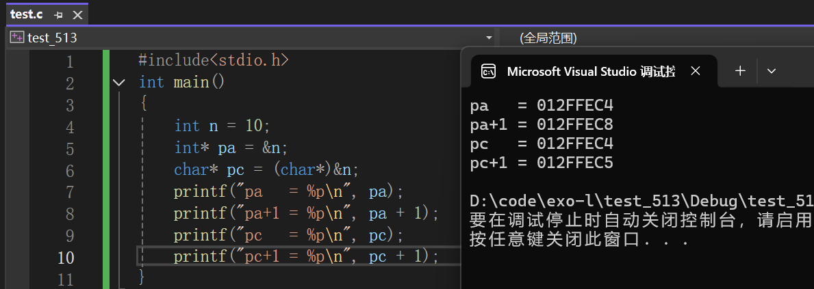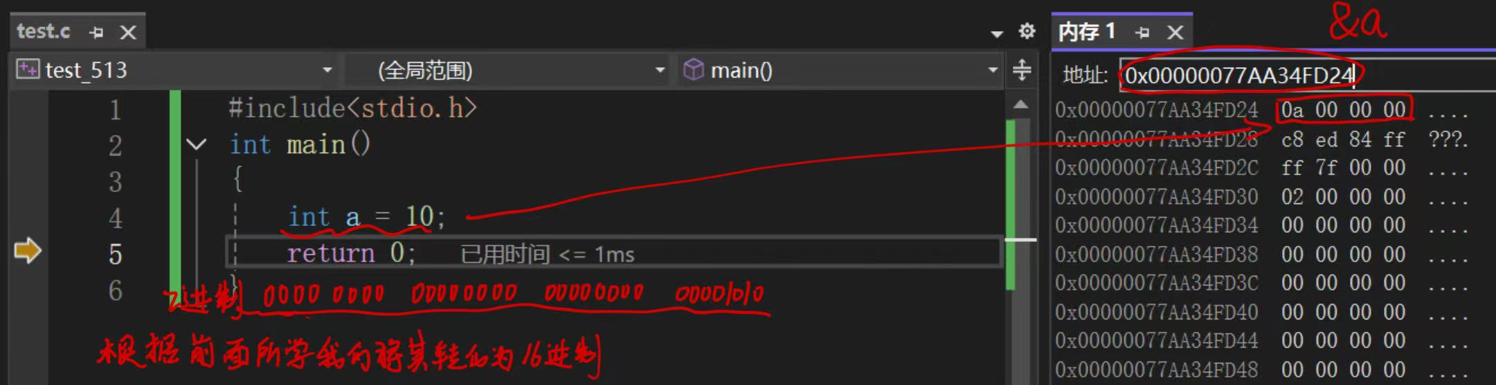这个打印的结果也是16进制的,我们发现结构与上次不一样,那是不是我们就错了呢,当然不是,上面我们就说过,向内存申请四个字节的空间,用来储存10,但是空间具体在哪是不知道的,我们给他们放在一张图中,可以看的清晰: