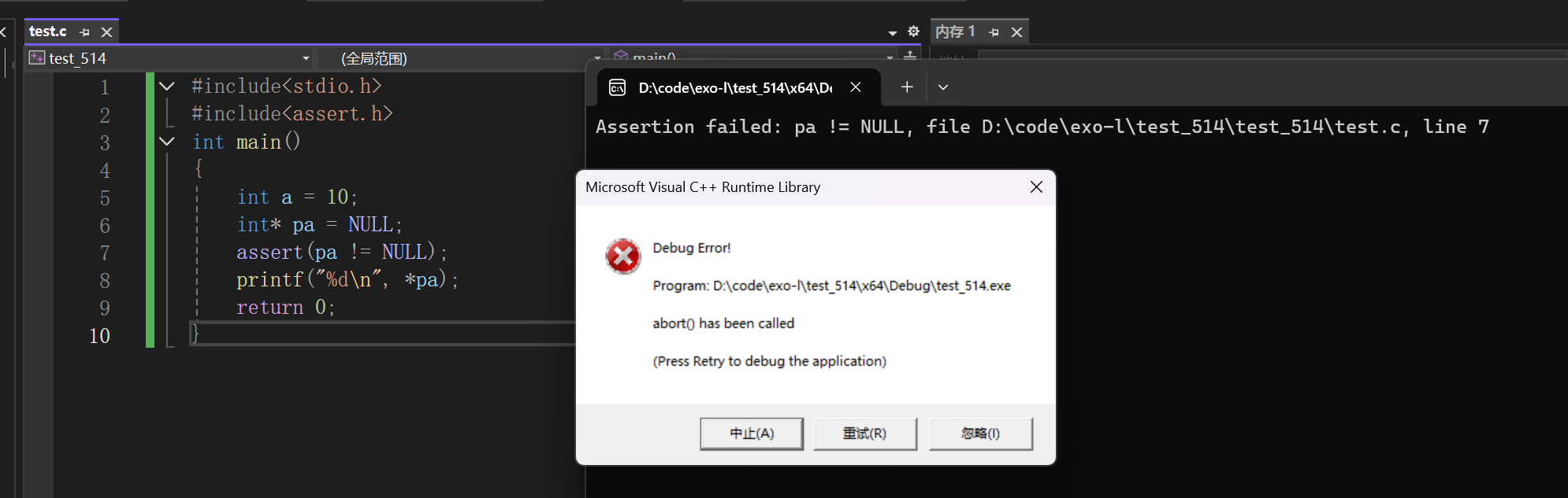 上面代码在程序运行到这一行语句时,验证变量 p 是否等于 NULL 。如果确实不等于 NULL ,程序继续运行,否则就会终止运行,并且给出报错信息提示。assert( ) 宏接受一个表达式作为参数。如果该表达式为真(返回值非零),assert( ) 不会产生任何作用,程序继续运行。如果该表达式为假(返回值为零),assert( )就会报错,在标准错误流stderr中写入一条错误信息,显示没有通过的表达式,以及包含这个表达式的文件名和行号。