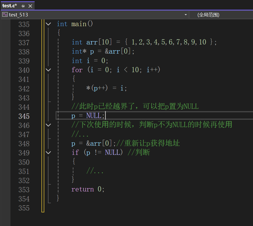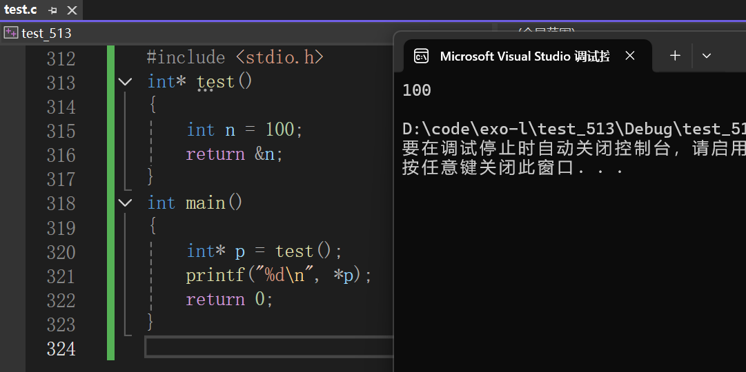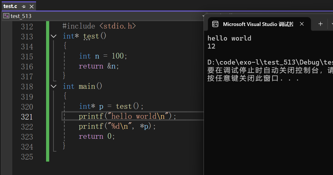 这段代码是野指针成因中 “函数返回局部变量地址” 的典型例子,test 函数返回了局部变量 n 的地址(&n) 。当 test 函数执行完,n 的生命周期结束,其占用的内存被系统收回。但 main 函数中 p 却接收了这个地址,此时 p 指向的内存已无效,p 就成了野指针。后续对 *p 解引用操作时,访问的是不确定甚至已被重新分配的内存区域,可能得到错误数据,或引发程序崩溃、未定义行为等。