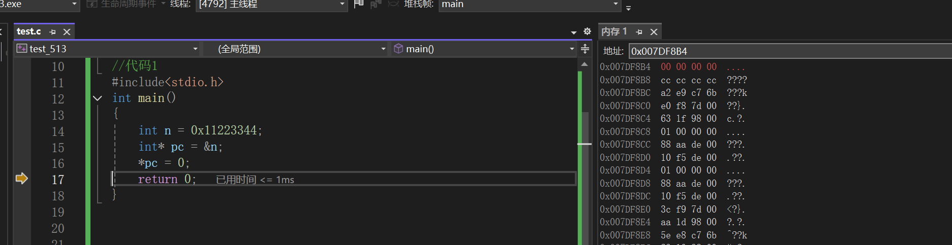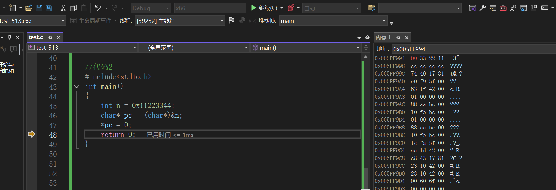 我们对上述俩段代码分别调试便可以看到:代码1会将n的四个字节全部改为0;但是代码2只是将n的第一个字节改为0。