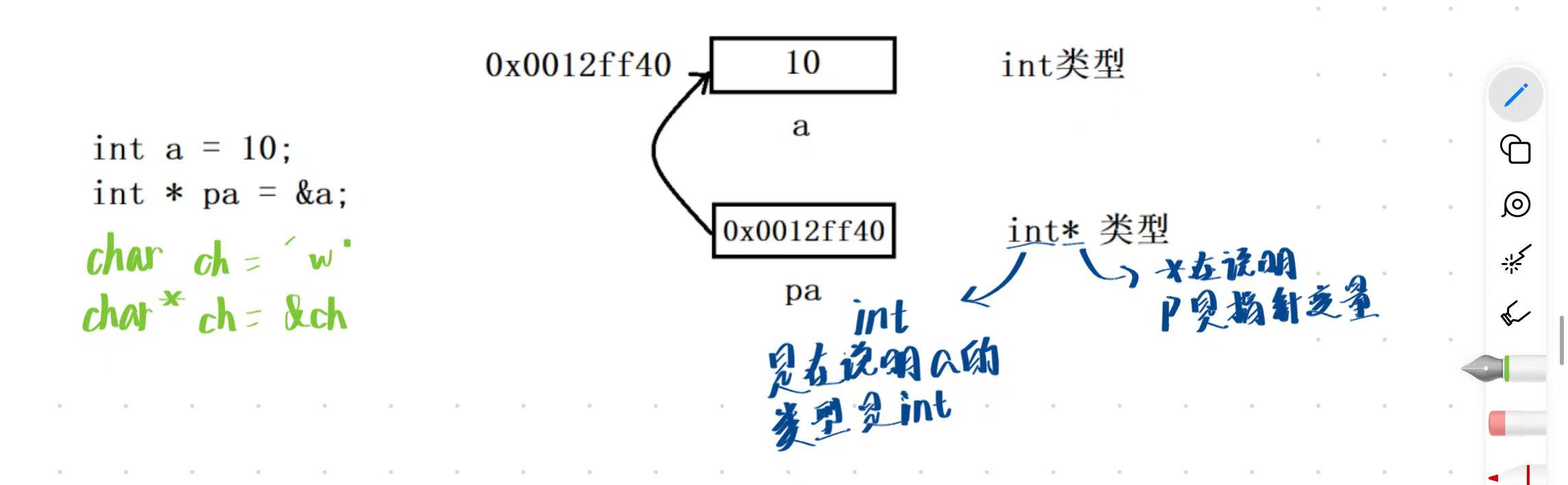 通过上面的学习,那我们通过取地址操作符(&)拿到的地址是一个数值,这个数值有时候也是需要存储起来,方便后期再使用的,那我们把这样的地址值存放在哪里呢?答案是:指针变量中。