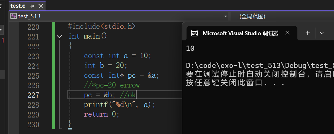 结论:const修饰指针变量的时候const可以放在*左边,const限制的是pc指向对象,也就是*pc不能给修改,但是pc不受限制,也就是指针变量可以改变指向